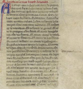Aquesta es la razos daquest siruentes. Al temps qen richartz era coms de peiteus. Anz quel fos reis. Bertrams deborn si era sos enemics. P(r)so qem bertrams uolia be(n) al rei ioue. Que guerreiaua adoncs ab en ric- hart quera sos fraire. En bertrams si auia fait iurar contran richart. lo bon uescomte de le- mogas. Que auia nom naemarz. El uescom- te de uentedorn. El uescompte de gumel. El co(m)- te de peiragors. eson fraire. El comte dengolei me. esos dos fraires. El comte raimo(n) de tolosa. El comte de flandres. El comte de barsolona. En centoill de sarac un comte de gascoigna. En gaston de bearn comte de bigora.El comte de digon. E tuich aquist sil abandoneron e fei- ron fatz ses lui .E ses p(er)iurero(n) uas lui. Enarmars lo uescons de le- mogas que plus lera tengutz d amor ede sagra- men sil abandonet efetz patz ses lui. En rich- artz cant saup que tuich aquist lauion aban- donat el sen uenc de nant autafort ablasoa- ost. Edis eiuret que iamais no sen partiria sil noill daua Autafort. Eno uenia ason coman- damen. Bertrams quant auzi so uen richartz auia iurat esabia quel era abandonatz de totz aquestz que uos auetz ausit. Sil det lo chastel esiuenc ason comandame(n). El coms richartz |