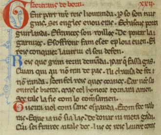 pros. Mas ges no(n) dis uertat aicel que men. Ni to(r)t lauzat no son pro ni ualen. Als baros qui argen blanda. Sirue(n)tes diras. Qe- Breton son for de garanda. E son donor bas. Car Sirue(n)tes uai ten cochos al comte cano(n) nugos. |