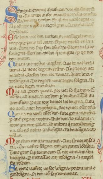 SEigner encoms ablasmar. Vos fai senes fa- lia.Quar noi auses anar. Puois ella oulia. Ala domna parlar. Et al for cataloigna. Al uostrops naieu uergoi(n)gna. Quar lai lais- ses fadiar. E fis drutz nos deu tardar. Si messagel uenia. Mas que pens del anar. Eques meta en la uia. Com no sap son afar. De sidonz ni sabe- soingna. Benleu atalan q(ue) ioingna. P(er) qe nos deu aturar. A quan uis nostre iutglar. Que de uas leis uenia. Ja nous degratz restar. Q(ue)us dones nor- mandia. Sacsetz bon cor damar. Antre bera e- bordoi(n)gna. De regart nous daratz soi(n). Ni ia nous degra menblar. Mas ara podetz proar. Ses uer so q(ue)u dizia. Q(ue) no fai ad amar. Rics hom p(er) drudaria. Ta(n)t an aconssirar. P(er) que iois damor los longna. Qeu no uoill auer bergoi(n)gna. Ses temer eses cela(r). Queuia no uoill esser bar. Nide gran mane(n)tia. P(er) que(m) pogues reptar. Nuls hom de uilania. Mais am rire gabar. Ab midonz q(ue) mensomoi(n)g- na. Q(ue)u no(n) uolria gasco(n)igna. Ni bertai(n)gna cap- dellar. Mon chan uir naemar. Quisonor ensab- ria. Cui nostre sei(n)gner car. Sa pauca lo(m)ba(r)dia. Tant gens sap domneiar. Q(ue) nos camia ni sen broi(n)gna. P(er) menassas anz resoi(n)gna. limogel fai reserar. Sil coms iaufres no ses loi(n)gna. Peitau aura e Gascoi(n)gna. Si tot no(n) sap domneiar.