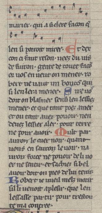 marier. qui a si clere facon q(ue) len si porroit mirer. Et dex con ci faut reson. ueez du uis de fuiron. gente de toute faco(n) or uos en ueut on mener. ro bert ne uaut un bouto(n) qui si lenlera mener. Sire uo(s) doit on blasmer sensi len lessiez mener. ce que tant poez amer et ou tant auez pouoir. nen deuez lessier aler. pour terre ne pour auoir. Mult par auroiz le cuer noir. quant uous en sauroiz le uoir. na uroiz force ne pouoir de li uo er ne sentir. et sachiez si bel auoir doit on pres de lui tenir. Robert ie uueil melz morir sil li uenoit aplesir. que len lessasse partir pour trestou te ma contree. |