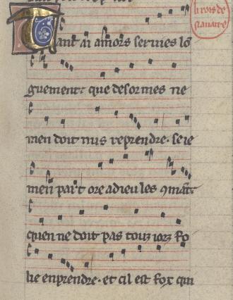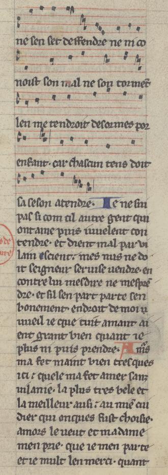 ne sen set deffendre ne ni co noist son mal ne son torme(n)t len me tendroit desormes por enfant. car chascun tens doit sa seson atendre. Ie ne sui pas si com cil autre gent qui ont ame puis iuuelent con tendre. et dient mal par vi lain escient; mes nus ne do it seigneur seruise uendre. en contre lui mesdire ne mespre(n) dre. et sil sen part parte sen bonement. endroit de moi ]u[ [1] uueil ie que tuit amant ai ent grant bien quant ie plus ni puis prendre. Am(or)s ma fet maint bien tresques ici; quele ma fet amer sanz uilanie. la plus tres bele et la meilleur ausi; au mie(n) cui dier qui onques fust choisie. amors le ueut et madame men prie. que ie men parte et ie mult len merci. quant |