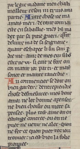 par le gre madame men chasti meilleur reson ni truis ama partie. Autre chose ne ma amors meri; de tant com iai este en sa baillie. mes b(ie)n ma dex par sa pitie gueri; q(ua)nt deliure ma de sa seignorie. quant eschapex li sui sanz p(er) dre uie. ainz de mes euz si bo(n) estre ne vi. si cuit ie fere on cor maint ior parti. et mai(n)t sonet et mainte rauerdie. Au conmencier se doit on bien garder; dentreprendre chose desmesuree. mes bone amor ne let honme a penser; ne bien choisir ou mete sa pensee. plus tost aime on en estrange contree. ou on ne puet ne uenir ne aler. quon ne fet ce quon puet toz iorz trouuer; ici est bien la folie prouuee. |