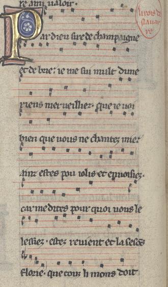 |  | li rois de nauar re Par dieu sire de champaigne et de brie; ie me sui mult dune riens merueilliez. que ie uoi bien que uous ne chantez mie; ainz estespou iolis et enuoisiez. car me dites pour quoi uous le lessiez. estez reuient et la seso(n)s florie. que touz li mons doit |
