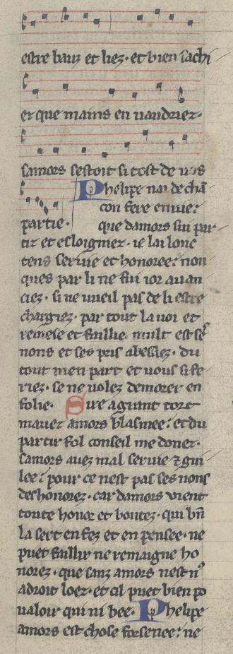 |  | estre bauz et liez. et bien sachi ez que mains en uaudriez. samors sestoit si tost de uos Phelipe nai de cha(n) con fere enuie; partie. que damors sui par tiz et esloigniez. ie lai lonc tens seruie et honoree; non ques par li ne fui ior auan ciez. si ne uueil pas de li estre chargiez. par tout la uoi et remese et faillie mult est se(s) nons et ses pris abessiez. du tout men part et uous si fe riez. se ne uolez demorer en folie. Sire a grant tort mauez amors blasmee; et du partir fol conseil me donez. samors auez mal seruie (et) gui lee; pour ce nest pas ses nons deshonorez. car damors uient toute honor et bontez. qui b(ie)n la sert en fez et en pensee. ne puet faillir ne remaigne ho norez. que sanz amors nest n(us) adroit loez. et cil puet bien po ualoir qui ni bee. Phelipe amors est chose forsenee; ne |