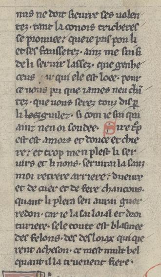 |  | nus ne doit sieurre ses uolen tez. tant la conois tricheres se prouuer; que ie pris pou li et ses faussetez. ainz me sui si de li seruir lassez. que genhe ceus par qui ele est loee. pour ce uous pri que iames nen cha(n) tez. que uous serez touz dis p(ar) li [loez] guilez. si com ie sui qui ainz nen oi soudee. Sire t(ro)p est est amors et douce et chie re; et trop men plest li ser uirs et li nons. seruirai la sanz moi retrere arriere; dueure et de cuer et de fere chancons. quant li plera sen aurai guer redon. car ie la sai loial et droi turiere. sele toute est blasmee des felons. des desloiax qui qie rent acheson. ce mest mult bel quant il la trueuent fiere. |