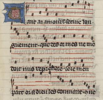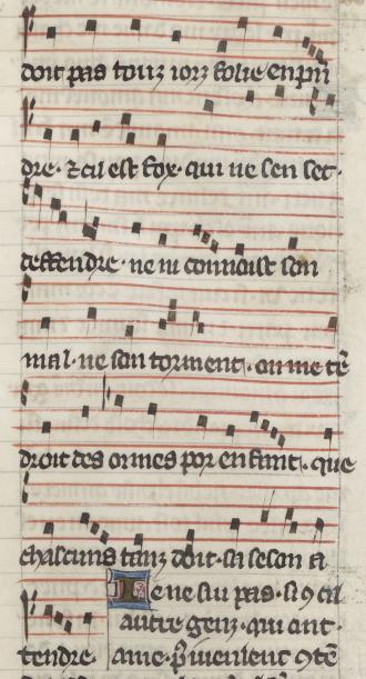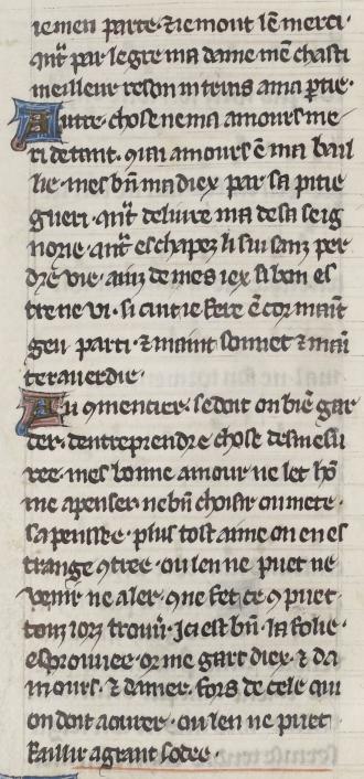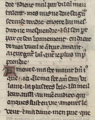 dre. (et) dient mal par uilai(n) mau talent. mes nus ne doit seign(our) seruise rendre. en(con)tre lui mes dire ne mesprendre. et sil sen p(ar)t par ]c[e [1] sen bonnement. endroit de moi uueil ie q(ue) tuit amant. aient g(ra)nt b(ie)n q(ua)nt ie plus ni p(uis) prendre. Amours ma fet maint b(ie)n i(us) que ] [ [2] ici q(ue)le ma fet am(er) sanz ui lanie. la plus tres bele (et) la meil leur aussi. au mie(n) cuidier. qui onques fust en uie amours le ueut. (et) madame. men prie. que |