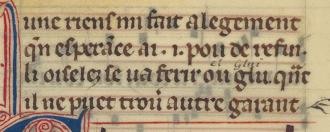 ce dame de moi mestuet douter car ie ni os parler de raencon ne stre ostaigiez sen bele guise non auec tout ce ne puis ie eschap(er). Dune chose ai au cuer g(ra)nt so pecon (et) cest la rien qui plus mi fait douter q(ue) tant de ge(n)z li uont tuit de(n)uiron. ie sai de uoir q(ue) cest por moi greu(er). ades dient dame on uos uuet guiler. mais il me(n) tent li traitor felon. ia p(ar) amors namera riches hons. car q(ui) plus a mieuz doit amors garder. Se ma dame ne uuet am(er) nui lui moi ne autrui (cinq cenz) m(er)ciz len rent. quassez ia dautres que ie ne sui qui la prient de fax cuer baudement. (et)baudise fait ga ai(n)gnier souant. mais ne sai ]r[ [1]; riens q(ua)nt ie deuant li sui. tant ai de mal (et) de poi(n)ne (et) dennui. q(ua)nt me couient dire a deu uos comant. Uos sauez bien co(n) ne conoist en lui ce co(n) conoist en autre plai(n)nement ma g(ra)nt folie onques ie ne conui. tant ai ame de fin cuer leaum(en)t. mai(s) |