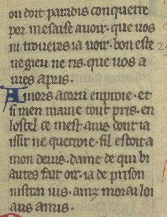 on doit paradis conquerre por mesaise auoir. que uos ni troueres ia uoir. bon este ne gieu ne ris. que uos a uies apris. Amors acoru enproie. et si men maine tout pris. en lostel ce mest auis dont ia issir ne querroie. sil estoit a mon deuis. dame de qui bi autes fait oir. ia de prison nistrai uis. ainz morai loi aus amis. |