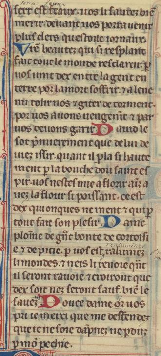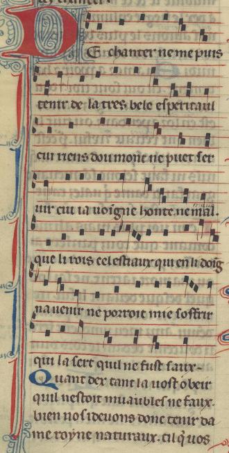 De chanter ne me puis tenir de la tres bele esperitaul cui riens dou mont ne puet ser uir cui ia uoi(n)gne honte ne mal. que li rois celestiaux qui en li doi(n)g nauenir ne porroit mie sosfrir qui la sert quil ne fust saux. Quant dex tant la uost obeir quil nestoit muaubles ne faux. bien nos ideuons donc tenir da me royne naturaux. cil q(ui) uos |