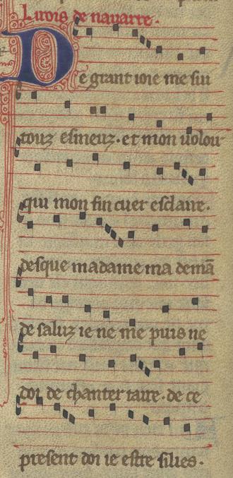 |  | Li rois de nauarre. De grant ioie me sui touz esmeuz. et mon uoloir qui mon fin cuer esclaire. desque ma dame ma dema(n) de saluz ie ne me puis ne doi de chanter taire. de ce present doi ie estre silies. |