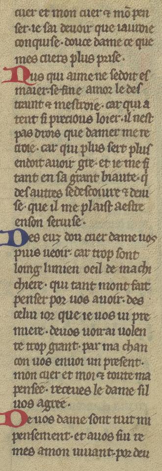 |  | cuer (et) mon cuer (et) mo(n) pen ser. ie sai deuoir que iauroie conquise. douce dame ce que mes cuers plus prise. Nus qui aime ne sedoit es maier. se fine amor le des traint (et) mestroie. car qui a tent si precious loier. il nest pas drois que damer me re croie. car qui plus sert plus endoit auoir gre. et ie me fi tant en sa grant biaute. q(ui) des autres se descoiure (et) deui se. que il me plaist aestre enson seruise. Des euz dou cuer dame uos puis ueoir. car trop sont loing li mien oeil de ma chi chiere. qui tant mont fait penser por uos auoir. des celui ior que ie uos ui pre miere. de uos uoir ai uolen te trop grant. par ma chan con uos enuoi un present. mon cuer et moi (et) toute ma pensee. receues le dame sil uos agree. De uos dame sont tuit mi pensement. et auos sui re mes amon uiuant. por deu |