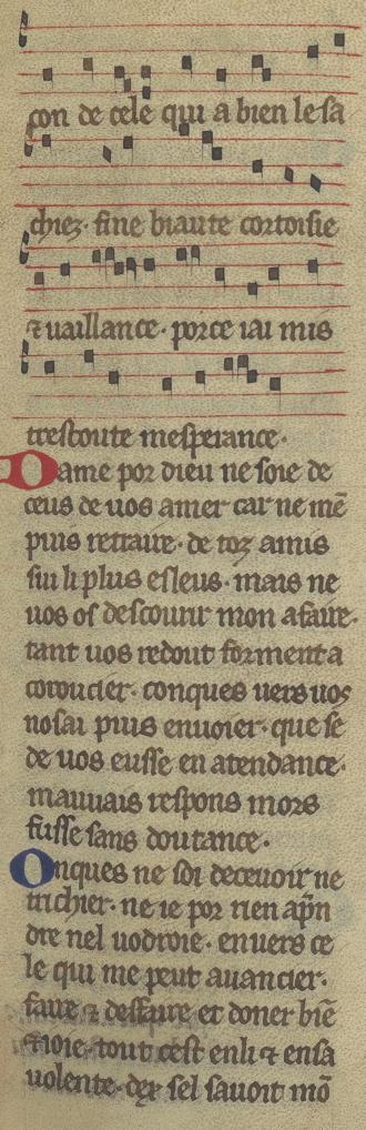 |  | con de cele qui a bien le sa chiez. fine biaute cortoisie (et) uaillance. porce iai mis trestoute mesperance. Dame por dieu ne soie de ceus de uos amer car ne me(n) puis retraire. de toz amis sui li plus esleus. mais ne uos os descourir mon afaire. tant uos redout forment a coroucier. conques uers uos nosai puis enuoier. que se de uos eusse en atendance. mauuais respons mors fusse sans doutance. Onques ne soi deceuoir ne trichier. ne ie por rien ap(re)n dre nel uodroie. enuers ce le qui me peut auancier. faire (et) desfaire et doner bie(n) (et) ioie. tout cest enli (et) ensa uolente. dex sel sauoit mo(n) |