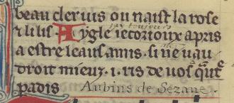 beau cler uis ou naist la rose (et) li lis. Aygle ie corroux apris a estre leaus amis. si ne uau droit mieuz .i. ris de uos q(ua)ut(re) p(ar)adis |