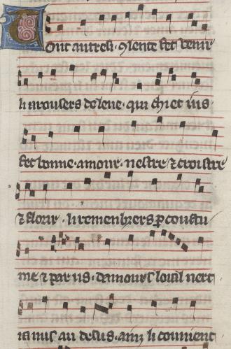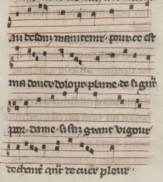 au desouz maintenir. pour. ce est ma douce dolour. plaine. de si g(ra)nt poor. dame. si faz grant uigour de chant(er) q(ua)nt de cuer plour. |