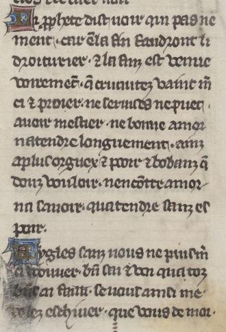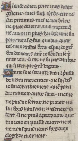 Li p(ro)phete dist uoir qui pas ne ment. car e(n)la fin faudront li droiturier. (et) la finz est uenue uoireme(n)t. q(ue) cruautez uaint m(er) ci (et) proier. ne seruises ne puet. auoir mestier. ne bonne amor natendre longuement. ainz aplus orguex (et) pooir (et) bobanz q(ue) douz uouloir. nen co(n)tre amor na sauoir. quatendre sanz es poir. Aygles sanz uous ne puis m(er) ci trouuer. b(ie)n sai (et) uoi qua toz b(ie)ns ai failli. se uous ainsi me. uolez eschiuer. que uous de moi. |
