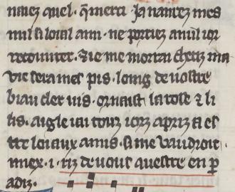 naiez quel. q(ue) merci. ia naurez mes nul si loial ami. ne porriez anul ior recouurer. (et) ie me morrai chetiz ma uie sera mes pis. loing de uostre biau cler uis. or naist la rose (et) li lis. aigle iai touz iorz apriz a es tre loiaux amis. si me uaudroit miex (un) riz de uous questre en p(ar) adiz. |