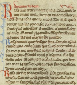 Bertrans de born. Rassa tant creis emonte puoia. Cella ques de totz enianz uoia. Sos pretz calas meillors en uoia. Cuna no(n) ia que rei nuoia. De uezer quesa beutatz luia. las pros ca sos obs cui quens uoia. Quel plus conoissent el meillor. Manteno(n) ades la lausor. Elateno(n) p(er) la gensor. Esap far ta(n)t entie ra honor. No(n) uol mas un sol preiador. Rassa domnai ques fresque fina. Cuncda egaia emesquina. pels saura qui ab color de robina. Blanca p(er) cors com flors de spina. Coude mol ab dura tetina. Esembl conil p(er) lesquina. Ala fina fresca color. Al bon pretz et ala lausor. pot hom ben triar la meillor. Sil que sen fan conoissedor. De mi uas cal part ieu ador. Rassa als rics es orgoillousa. Efai gran sen alei de tosa. Que no(n) uoill peitieus ni tolosa. Ni bre tai(n)gna ni saragosa. Ans estant de pretz enueiosa. |