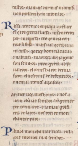 dastor. e iamais darmas ni damo(r). non parllera hom iuron lor. Rassa atot dic e enplaça. qe flacs es qide gerras lassa . ni % sen recrei %qi per menassa. tro qe ueza con tort li fasa. mais ual qe ribieira ni cassa. qe rics hom nacueilh e nabrasa. maoretz ab nagout son seinhor. pren gerra ab p(re)z ualedor. el coms hacor denua sidor. el uescoms de defendedor. e uenial adoncs al pascor. [m] ariner uos aues honor. e nos a- uem cha(m)iat seinhor. bo(n) gerrier per torniador. e iamais golfi ers delator. nos don de mon chantar paor. Pauiol mon chantar ricor. en la cort mon bel mal seinhor. |