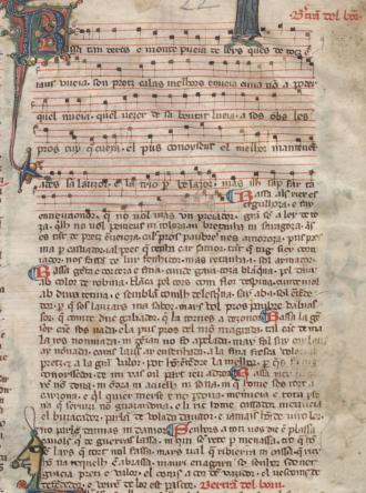 B(er)tra(n) del bor(n) Rassa tan derts e monte pueia de leys ques de totz e(n) iaus vueia. son pretz calas melhors enueia cuna no(n) a poder quell nueia. quell uezer de sa beutat lueia. a sos obs les pros cuy q(ue) cueya. el pus conoysent el melhor mantene(n)t ades la lauzor. e la trio p(er) belazor. mas ilh sap far ta- entieiraonor. q(ue) no uol mas vn preiador. Rassa als ricx es ergulhoza. e fay gra(n) se(n) a ley de to za. q(i)lh no uol peitieus ni toloza. ni bretanha ni saragoza. a(n)s es ta(n)t de pretz e(n)ueioza. cal(s) pros paubre(s) nes amorosa. pus pres ma p(er) castiador. ial prec q(ue) tenha car samor. ta(n)t q(ue) tug siey corte iador. nos fassa(n) de luy senhidor. mas retanha .i. sol aymador. Rassa ge(n)ta e corteza e fina. cunde gaya. toza bla(n)q(i)na. pel daur ab color de robina. bla(n)ca per cors com flor despina. cunde mol ab dura tetina. e sembla(m) conilh delesq(i)na. say ab .i. sol e(n)te(n)de- dor. p(er) q(ue) sos lauzars ma sabor. mays vol pros paubre valuas sor. q(ue) comte duc galiador. q(ue) la tornes a dezonor. Rassa la ge(n)- ser ca(n)c fos nada. ela pus pros del mo(n) magrada. tal ca(n)c de ma- la res nonmada. ni de(n)ian no fo apelada. may fol suy car laus ay no(m)nada. caras laus ay ensenhada. ala fina fresca color. al pretz (et) la gra(n) ualor. pot ho(m)z e(n)te(n)dre la melhor. p(er) q(ue)s fa(n) tug conoyssedor. de mi vas cal part ieu adzor. Rassa ricx ho(m) q(ue) re(n) no(n) dona. ni o(n)dra ni acuelh ni sona. ni q(ue) home ses tort a cayzona. e q(i)l quier merse e no p(er)dona. menueia e tota p(er)so na q(ue) seruizi no(n) guazardona. e li ric home cassador menueia el buzacador. parla(n) de volada daustor. e iamais ho(m)z de uiro lor. no parle darmas ni damor. Senhors a totz uos dic e(n) plassa cauols q(i) de guerras lassa. ni qui se(n) rete p(er) menassa. tro q(ue) ho(m) se(n) lays q(ue) tort nol fassa. mays ual q(ue) ribieyra ni cassa. q(ue) ricx ho(m) na requelh e(n) abrassa. mauri enagarn so senhor sdonet gracia pretz e valor. el coms a cor de(n) vazidor. el uescoms de defe(n)dedor. e veire(m) de lor est pascor. |