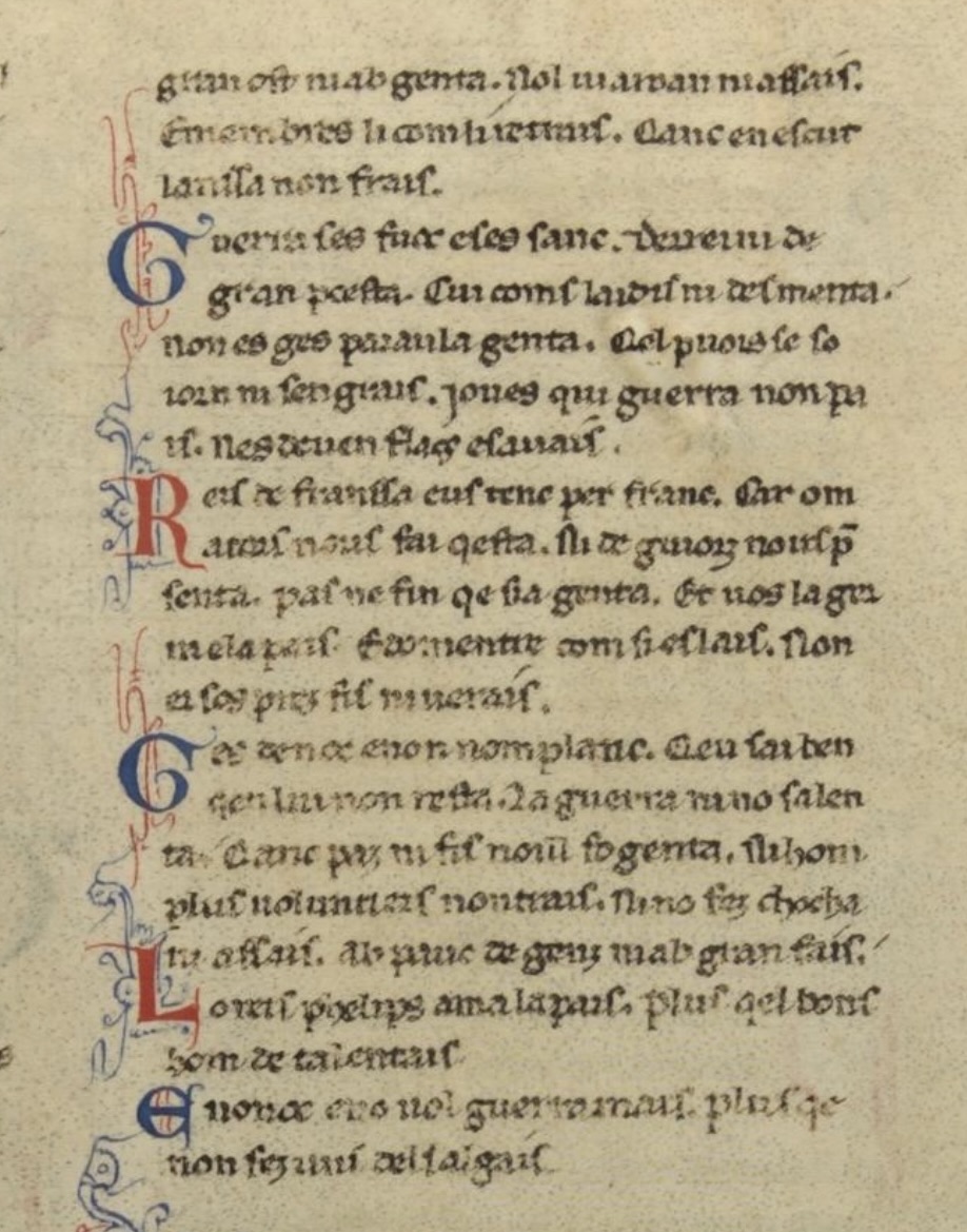 gran ost niab genta. Nol iuaroan niassais. Emembres li comliretrars. Qanc en escut lamsa non frais. Guerra ses fuoc eses sanc. Deareini de – Reis de franssa cus tenc per franc. Car om Ges den oc enon nomplanc. Qeu sai ben