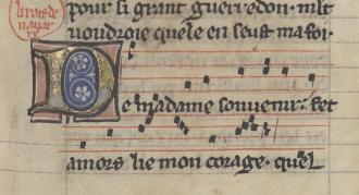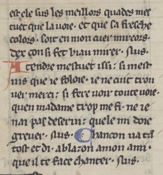 est ele sus les meillors quades mes tuet que la uoie. et que sa fresche colors. soit en mon cuer mireors. dex con si fet biau mirer. nus. Atendre mestuet issi; si mest uis que ie foloie. ie ne cuit trou uer merci; si fere uoir toute uoie. quen madame trop me fi. ne ie nai pas deserui; quele mi doie greuer. nus. Chancon ua ta(n) tost et di. ablazon amon ami. que il te face chanter. nus. |