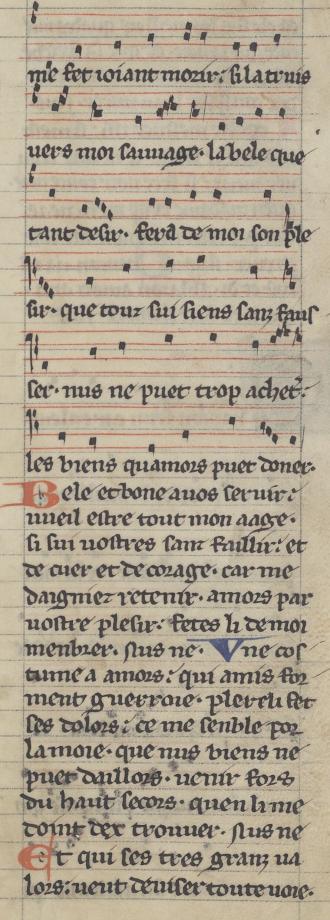 me fet ioiant morir; silatruis uers moi sauuage. la bele que tant desir. fera de moi son ple sir. que touz sui siens sanz faus ser. nus ne puet trop achet(er); les biens quamors puet doner. Bele et bone auos seruir; uueil estre tout mon aage. si sui uostres sanz faillir; et de cuer et de corage. car me daigniez retenir. amors par uostre plesir; fetes li de moi menbrer. nus ne. Une cos tume a amors; qui amis for ment guerroie. plereli fet ses dolors; ce me senble por la moie. que nus biens ne puet daillors. uenir fors du haut secors. quen li me doint dex trouuer. nus ne Et qui ses tres granz ua lors; ueut deuiser toute uoie. |