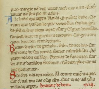 pros. Mas ges no(n) dis uertat aicel que men. Ni to(r)t lauzat no son pro ni ualen. Als baros qiu argen blanda. Sirue(n)tes diras. Qe- nanz que passon lo pas. Veion siler foudatz gra(n)- da. siler sens odanz opros. Car per sei(n)gnor dormillos. No uoill i(n)trar en guerra ni enconten. Car greu con- quier hom ben terra dormen. Breton son for de garanda. E son donor bas. Car Sirue(n)tes uai ten cochos al comte cano(n) nugos. |