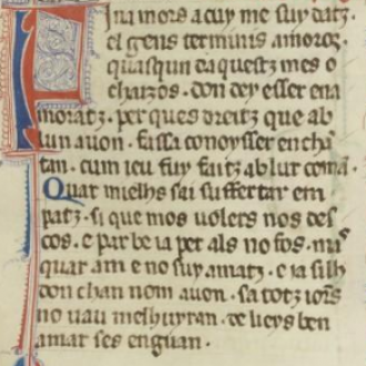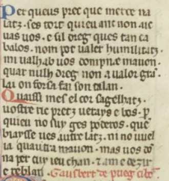 Per queus prec que merce na iatz. ses tort quieu anc non aic uas uos. E sil dreg ques tan ca balos. Nom pot ualer humilitatz. mi uaillab uos dompnae mauon. quar nulh dres non a ualor grà. lai on forsa fai son talan. Quaissi mes el cor sagelhatz. uostre ric pretz uetays e bos. P(er) quieu no suy ges poderos. Que biaysse ues autre latz. ni non uuel ia quautra mauon. Mas uos do na per cuy ieu chan. Et am e dezir e reblan. |