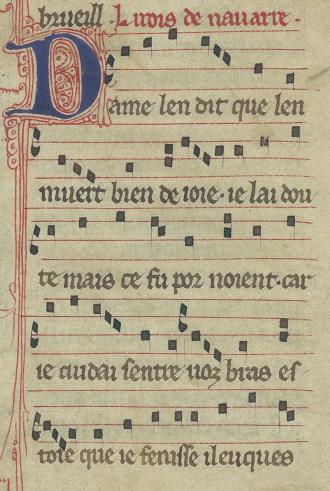 li rois de nauarre. Dame len dit que len muert bien de ioie. ie lai dou te mais ce fu por noient. car ie cuidai sentre uoz bras es toie que ie fenisse ileuques |