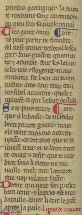paradis gaaingnier. la aurai ie ma dame sanz containdre. ou dieu fera sa parole remai(n) Tres grant amor dre. ne peut partir ne fraindre. sel nest encuer desloial losen gier. faus guilleor quamen tir (et) afaindre. font les loiaus de lor ioie esloignier. mais madame set bien au mien cuidier. aces douz moz coin tes sibel ataindre. quele i conoist ce qui lafait destrai(n) Se ie puis uiure dre. que il li chaille. de ma dolor bien porroie guerir. mais ele tient mes dis a contro uaille. et dit ades que ie la uueill trair. et ie laim tant et couoit (et) desir. que ie cuit bien sans li riens ne me uaille. melz aim lamort que trop uilaine faille. Dame qui ueut son prison bien tenir. (et) lapris a si dure bataille. doner li doit le grai(n) apres la paile. |