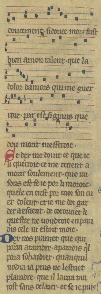 doucement. si douce morz fust bien amon talent. que la dolor damors qui me guer roie. par est si grans que dou morir mesferoie. Se dex me doint ce que ie li querroie. ce me retient a morir soulement. que rai sons est se je por li moroie. quele en eust por moi son cu er dolent. et ie me doi gar der a escient. de coroucier li questre ne uoudroie en para dis cele ni estoit moie. Dex nos pramet que qui porra ataindre aparadis q(ui)l pora sohaidier. quanquil uodra ia puis ne lestuet plaindre. que il laura tan tost sans delaier. et se ie puis |