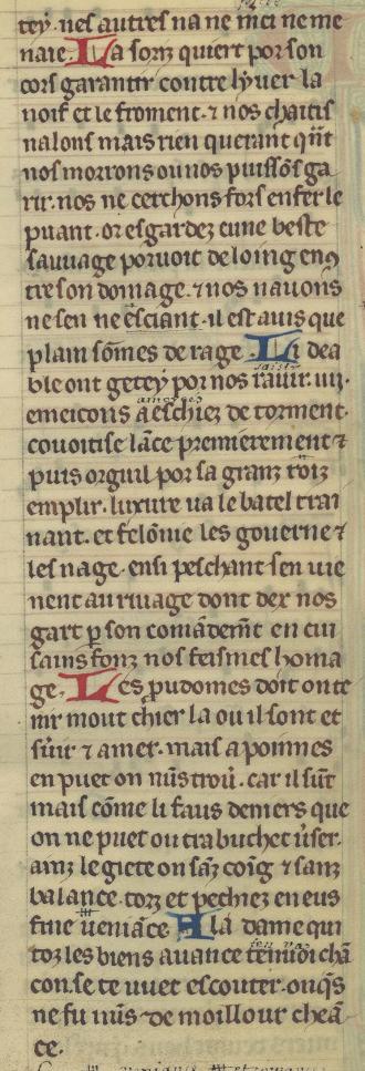 tey nes autres na ne m(er)ci ne me naie La soriz quiert por son cors garantir contre lyuer la noif et le froment. (et) nos chaitis nalons mais rien querant q(ua)nt nos morrons ou nos puisso(n)s ga rir. nos ne cherchons fors enfer le puant. or esgardez cune beste sauuage poruoit de loing en(con) tre son domage (et) nos nauons ne sen ne esciant. il est auis que plain som(m)es de rage. Li dea ble ont getey por nos rauir. (quatre) emeicons aeschiez de torment. couoitise la(n)ce premierement (et) puis orguil por sa granz roiz emplir. luxure ua le batel trai nant. et felo(n)nie les gouerne (et) les nage. ensi peschant sen uie nent au riuage dont dex nos gart p(ar) son coma(n)dem(en)t en cui sains fonz nos feismes homa ge. Les p(ro)udomes doit on te nir mout chier la ou il sont et s(er)uir (et) amer. mais a poinnes en puet on nu(n)s trou(er). car il su(n)t mais co(m)me li faus deniers que on ne puet ou trabuchet u(er)ser ainz le giete on sa(n)z coi(n)g (et) sanz balance torz et pechiez en eus fine uenia(n)ce. A la dame qui toz les biens auance ten uoi cha(n) con se te uuet escouter onq(ue)s ne fu nu(n)s de moillour chea(n) ce.  |
