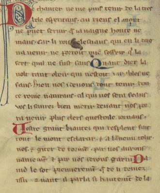 De chanter ne me puis tenir de la tres bele esperitaus. cui riens el mont ne puet seruir q(ue) ia uaigne honte ne maus. car li rois celestiaus qui en li daig na uenir ne porroit mie soffrir q(ui) la sert quil ne fust saus Quant diex tant la uolt tant obeir qui nestoit muables ne faus. bien nos ideuons dont tenir dou ce roine naturaus. cil qui uos sera feaus uos li saurez bien merir deuant uos por ra uenir plus clers questoile iornaus. Vostre grant biautez qui resplent fait tout le mont esclarcir. (et) a la(n)nemi tolir. nos. (et) giter de torm(en)t. par uos aurons uaniem(en)t (et) par uos serons garni Da uid le sot premierem(en)t q(ue) de li deuiez issir [1] quant il parla si hautem(en)t de la |