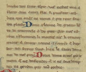 bouche dou saint espir. uos nesties mie a florir ainz auiez flor si puissant. cest dieu qui onq(ue)s ne menti (et) par tout fait son plaisir Dame plainne de grant bo(n) te de courtoisie (et) de pite. par uos est touz ra(n)luminez li mondes nes li renoiez. quant il seront rauoie. (et) croiro(n)t q(ue) diex soit nez seront sauf bien le sauez dame aiez de nos pitie. Douce dame or uos pri ie merci q(ue) me deffendez. q(ue) ie ne soie damp nez ne perduz par mo(n) pechie. |