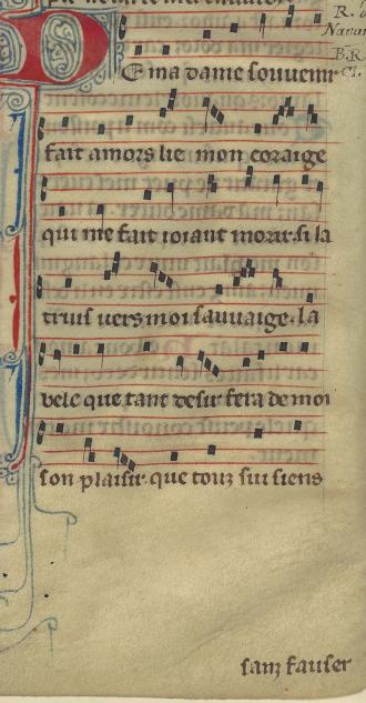 De madame souuenir fait amors lie mon coraige qui me fait ioiant morir. si la truis uers moi sauuaige. la bele que tant desir fera de moi son plaisir. que touz sui siens sanz fauser |