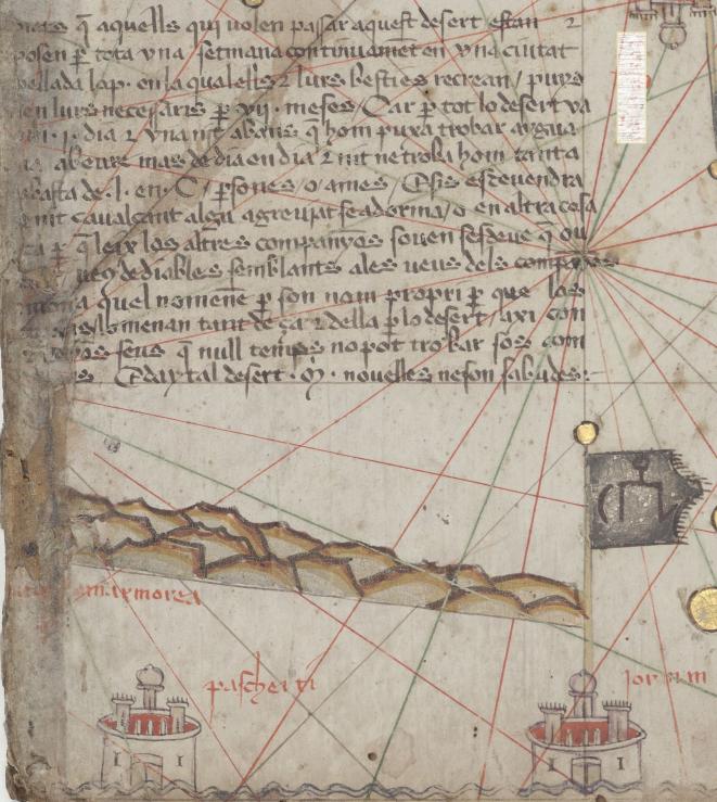 | [..]piats que aquells quj uolen passar aquest desert estan (e) [r]eposen p(er) tota una setmana continuame(n)t en una ciutat [..]pellada lop. enla qualells (e) lursbesties recrean/ puys [..]en lurs necessaris p(er) .vij. meses/ Car p(er) tot lodesert ua [.]om .j. dia (e) una njt abans q(ue) hom puxa trobar aygua [.o]na abeure mas de diaen dia (e) nit ne troba hom tanta [.] abasta de .l. en .C./ p(er)sones/ o/ ames/ Esis esdeuendra [.a] nit caualcant algu agreujatseadorma o en altra cosa [..]ta p(er) q(ue) leix los altres companyo(n)s souen sesdeue q(ue) ou [.] ue(us) dediables semblants ales ueus dels compa[n]yo(n)s [.]mona quel nomene(n) p(er) son nom propri p(er) que los [.....]is/ lo menan tant de ça (e) della p(er) lo desert/ axi con [....]o(n)s seus q(ue) null temps no pot tro bar sos com [.......]s. Edaytal desert .m. nouelles ne son sabudes. 22. [...]ta[.] [.]emarmorea 9. pascherti 10. jor nam |