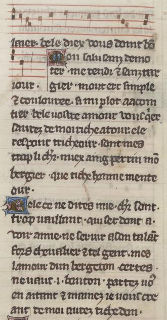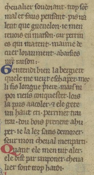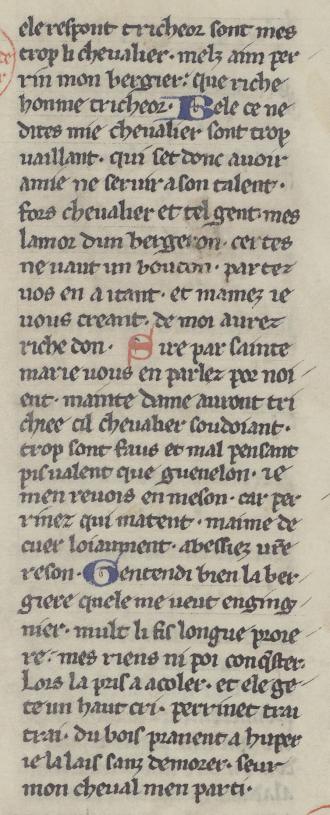 |  | Sire par sainte marie uous en pallez pour noiant. mai(n)te dame auront trichiee cil ch(eualie)r soudoiant trop sont faux (et) mal pensant. pis ualent que guene lon. ie men reuois en meson. car perrines qui mi atent maime de cuer loiaument abessiez uostre reson. Ientendi b(ie)n la bergiere q(ue)le me ueut eschaper. mout li fiz. longue priere. mes ni poi rie(n)z (con)quester. lors la priz aacoler. (et) ele iete .i. haut cri perrinet trai |