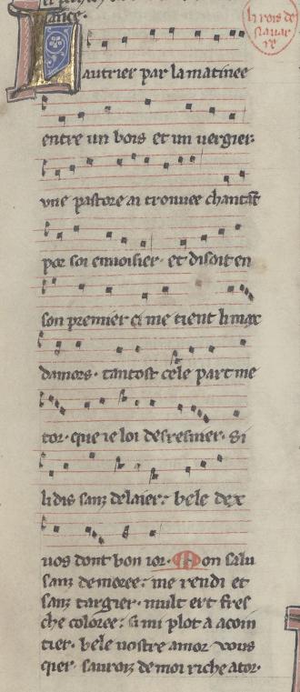 | Li rois de nauare Laut(rie)r par la matinee entre .i. bos (et) .i. uergier. une pastore ai tro uee chantant pour soi en uoisier. (et) disoit .i. son premier. chi me tient li maus damors tantost cele part men tor. ke ie loi desraisnier. se li dis |