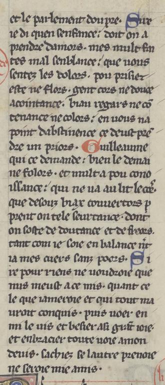 |  | et le parlement doupre. Sire ie di quen senfance; doit on a prendre damors. mes mult fai tes mal senblance; que uous sentez les dolors. pou prisiez este ne flors. gent cors ne douce acointance. biau regars ne co(n) tenance ne colors; en uous na point dabstinence ce deust pre(n) dre un priors. Guilleaume qui ce demande; bien le demai ne folors. et mult a pou cono issance; qui ne ua au lit le cor(s). que desouz biax couuertors [p] prent on tele seurtance. dont on soste de doutance et de freors. tant com ie soie en balance n(er)t ia mes cuers sanz poors. Si re pour riens ne uoudroie que nus meust ace mis. quant ce le que iameroie et qui tout ma uroit conquis. puis uoer en mi le uis et besier asi gra(n)t ioie. et enbracier toute uoie a mon deuis. sachiez se lautre prenoie ne seroie mie amis. |