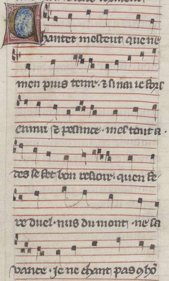 |  | Chanter mesteut que ne men puis tenir. (et) si nai ie fors ennui (et) pesance. mes tout a. des se fet bon resioir. quen fe re duel. nus du mont. ne sa vance. je ne chant pas (com) ho(m) |