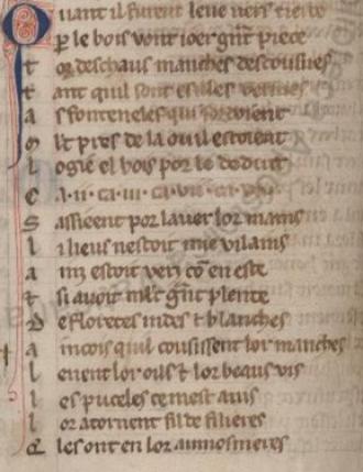 Quant il furent leve vers tierce p(er) le bois vont ioer g(ra)nt piece t oz deschaus manches descousues t ant quil sont es illes venues a sfontenels qui sordoient m (ou)t pres de la ouilestoient l ogie el bois por le deduit C a.ii.ca.iii.ca.vii.ca viii. S assient por lauer lor mains l ilieus nestoit me vilains a inz estoit verz co(m) en este (et) si avoit m(ou)t g(ra)nt plente D efloretes indes (et) blanches a incoins quil cousissent lormanches l euentlor oils (et) lorbeaus vis l es puceles cemest auis l or atornent filde filieres q(ue) lesont en lor aumosnieres