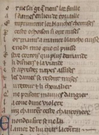 o rnesai ge q(ue) riens lor faille a sdames en lieu de touaille E mpruntent lorblanches chemises p(er) ceste ochoison si ont mises l or mains a mainte blanche cuisse J enedi mie que cil puisse E stre cortois quiplus demande (et) li disners (et)laviande e st aprestez napes assiser (et) lesdames se resont mises a uretour (et) li cheualier Q(ui) neprisent mauues dangier l acoue duneviolete a inz chante(n)t ceste chanconete E nondeusire se ne lai |