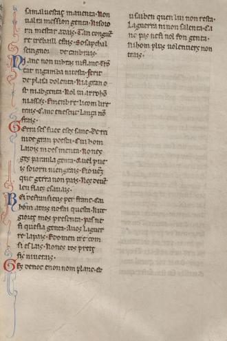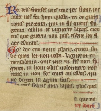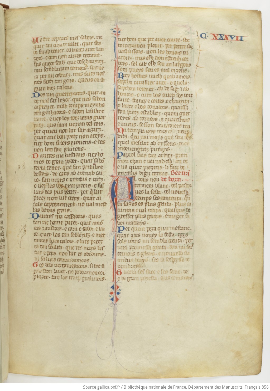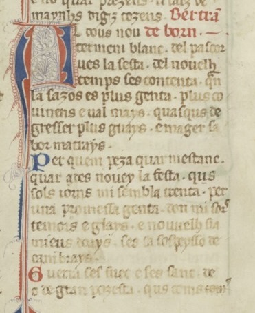 | men lui et un son conpai(n)gnon. Et artuset (et) us sos conpai(n)gs accusseron un iuzieu don li iuzieu aneron al rei epregueron lo quel enfezes uen- deta equelor des artus el conpai(n)gnon p(er) aucire. equill li darian.cc.marabotis.el reis los lor do net amdos epres los.cc. marabotis.eill iuzieu les feiron ardre lo iorn de la natiuitat de crist si comdis Guillems de berguedam en un sieu s(ir)- uentes dizen en el mal del rei. Efetz una mes preison. Don hom nol deu razonar. Quel iorn de la naision. fetz dos crestias brusar. Artus ab autre son par. Eno(n) degra aici iutgar amort ni apassion. Dos p(er) un iuzieu fellon. Don us autre que auia nom peire ioglar li p(re)stet deniers eca- uaus. et aquel peire ioglars si auia grans ma- ls ditz de la ueilla reina denglaterra. la quals tenia font ebrau. que es una abadia onse rendon to- tas las ueillas ricas. et ella lo fetz ausire p(er) parau la del rei darragon. etotz aquestz laich faich re menbret enbertrans de born al rei darragon en aquest sirue(n)tes que dis. Quant uei p(er) uergiers despleiar. los cendaus grocs indis. (et) cetera |
