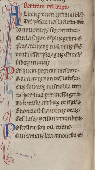 | es una abadia on se rendon totas las ueillas ricas. et ella lo fetz ausire per paraula del rei daragon. etotz aquestz laitz faich reme(n)bret en bertrans de born al rei daragon en aquest sirue(n)- tes que dis. Quant uei per uergiers desple- iar. los cendaus grocs indis (et) c(er). |