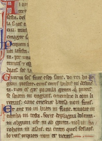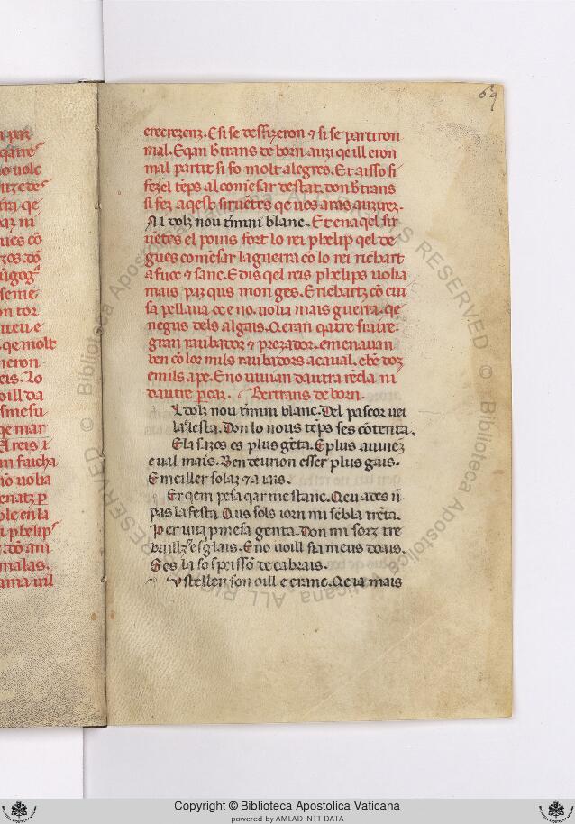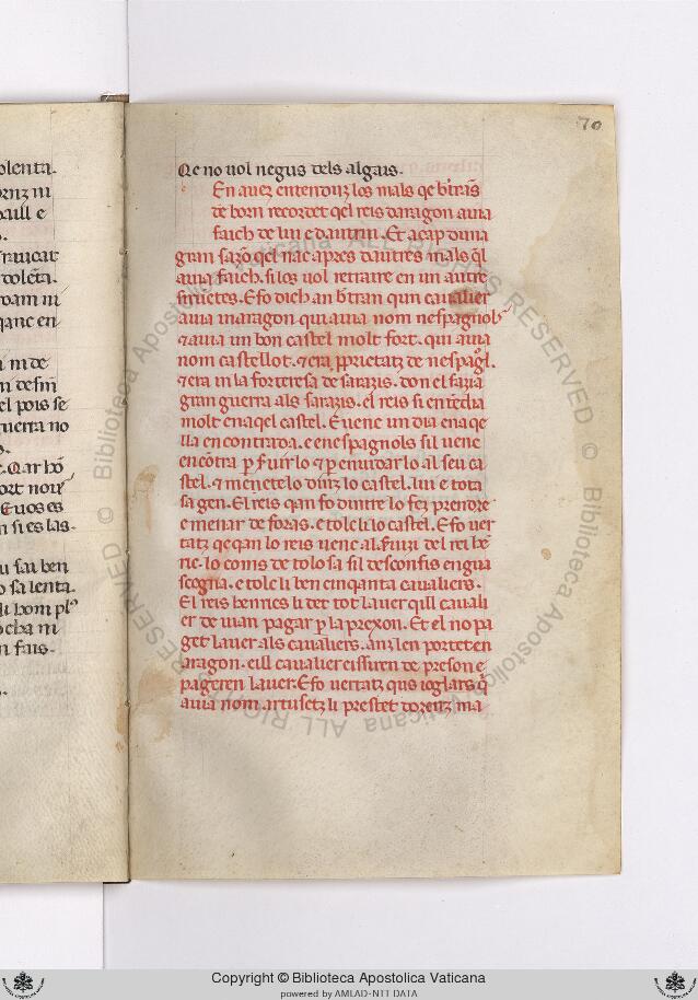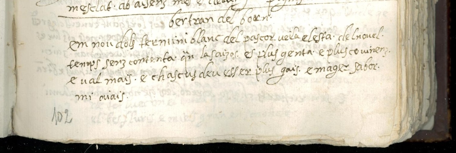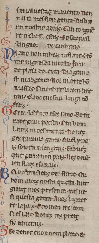 BEn auetz entendutz los mals quen bertrans de born reme(m)bret. quel reis darrago(n) auia faitz de lui edautrui. Et acap duna gran sa- zon quel nac apres dautres mals quelauia faitz li lol uolc retraire en un autre sirue(n)tes. Efon dig anbertran cun cauallier auia enarragon que auia nom nespai(n)gnols. Et auia un bonca stel molt fort que auia nom castellot. et era p(ro)- prietat denespai(n)gnol et era en la forteressa de sa- rrazins. Don el fazia grant guerra als sarrazis. El reis si ente(n)dia molt enaquel chastel. Euenc uniorn enaquella encontrada. p(er) seruir lo eper enuidarlo al sieu castel. Emenet lo charament lui ab tota soa gent. El reis qua(n)t son dedinz lo castel lo fetz penre et menar de foras etolc lo castel efon u(er)tatz q(ue) quant lo reis uenc al seruizi del rei enric.lo com(s) de tolosa sildesco(n)fis engascoi(n)gna etolc li ben cin- quanta caualliers. El reis enrics li det tot lauer queill cauallier deuian pagar p(er) la reenson.et el nol paguet lauer als caualliers. Anz lenportet e(n) arragon. Eill cauallier isseron de preisson epage ron lauer. E fon uertatz cus ioglars q(ue) auia nom artuset li prestet.cc. marabotis. Emenet lo ben un an absi enoillen det denier. Eca(n)t uenc un di- a artuset ioglars sise meslet abun iuzieu [...] juzieu li uengron sobre enafreron a[...] |