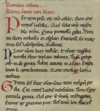 [b] Ertrans deborn si era druz dema do(m)pna maenz de montaignac de la moiller de talaran. qera ai tals do(m)pna co(m) eu uos ai ditz enla razo del sirue(n)tes de la do(m)pna soi seubuda. E si co(m) eu uos dis ellal parti de se edet li co(m)iat. (et) encuset lo de madopna guiscarda de la moiller del uesco(m)te de co(m)born. duna ualen do(m)pna qe fo deber goigna soror de guiscart de bel ioc. auine(n) do(m)pna (et) enseignada ebel la de totas beutaz. Si la lauzaua. fort encontan echantan. B(ertrans) en nanz qe la uijs era sos amics p(er) lo ben qel auzi della. Ez enanz qella fos uenguda amarit alue sco te de co(m)born. Ep(er) la legresa qel ac dele soa ue(n)guda si fez aqestas coblas qe dizo(n). [a] le mozin francha terra cortesa. Molt me sap bo qar tals honors uos creis. |