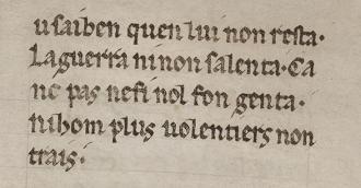 son castel autafort el croset lo reis. richart. epasset oltramar. E bertrans remas guerreian co(n) nai mar lo uesco(m)te de lemoges econ lo comte de peiregors. eco(n) totz lo(s) autres baros de uiron. Esico(n) auez ente(n)dut. qan.R(ichart). sen tornaua. el fo pres enalemagn. (et) si estec en preson dos anz esi serez emet p(er) auer.Eqan. B(ertrans)de born saup q(e)l reis deuia essir de preison molt fo alegres p(er) lo gran ben qel sabia. qel auria del rei.ep(er) so dan qe se ria asos enimics. Esapchatz q(e)n bertran auia escript en son cor totz los mals el danz qe aquist guereiador auian faitz en lemo zin (et)en las terras del rei. R(ichart). E fez son sirue(n)tes. B(ertrans). deborn. |
