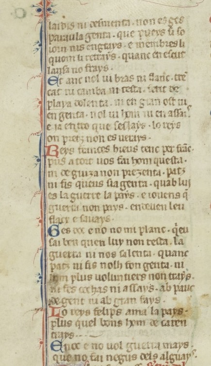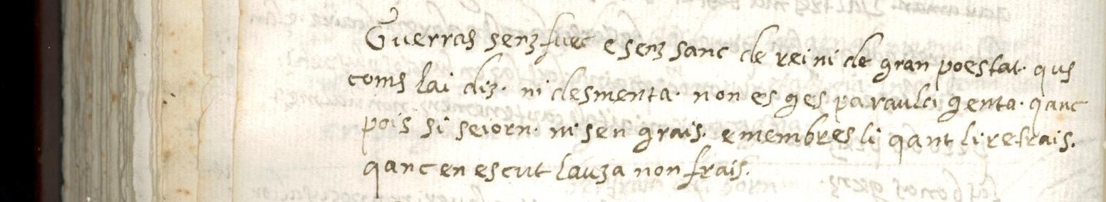 | edesmesuras en las terras del rei de fransa. Q(ue)mar- cauon ablas terras d[enrichart]. El reis felips ueni a areclam adaicels [...] faita la patz entre lor dos. Enrichartz no uolia [...] dreg far. Don fon ordenatz p(er) lor uns pa[...] en fo- ron ensems en la ma[rcha de torena e de...] El reis felips si fetz mains reclams den richart. Don ambdui uengron agrans paraulas (et) as ma- las. Si quen richart lo desme(n)ti el clamet uil re- crezen esis desfieron esis partiron mal. Ecant Bertrans de born auzi queil eront mal partit si fo molt alegres. Et aisso fon el temps al comen- same(n)t destiu. Don Bertrans fetz aquest siruentes que uos aras auziretz. Al douz termini blanc. del pascor uez la estat. Et enaquel s(er)uentes el pois fort lo rei felip. Quel degues comensar la gue(r) ra ablo rei richart. afuoc et asanc. Edis quell re- is felips uolia mais patz cuns morgues. Enrich- art ab cui el sapellaua oc eno(n) mais guerra que negus dels algais. Queron quatre fraire gran raubador eraubauen emenauen ben ablor mil raubadors acaual eben doa milia ape. Eno uiui- on <dautra> dautra renda ni dautre perchatz. |