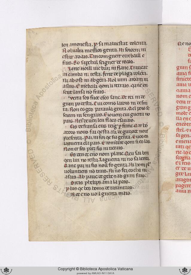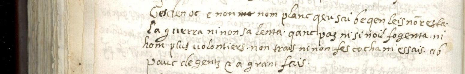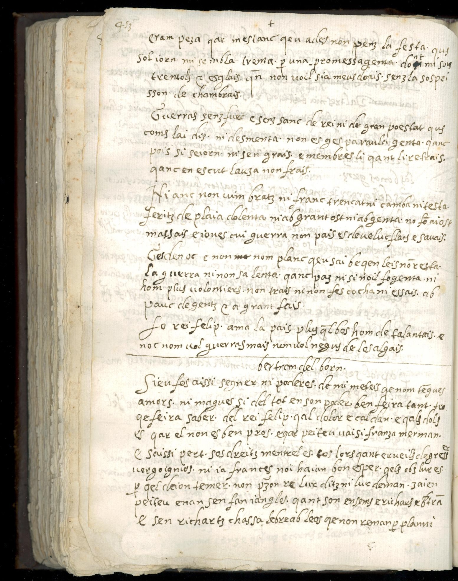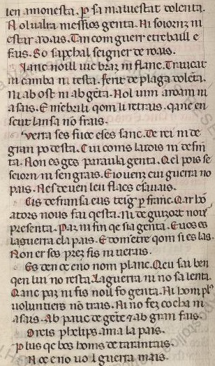 | pesa. Et ac dich al rei felip com perdia d(en) ci(n)c ducaz los tres. ede giortz la renda el perchaz. Eco[...] caercins remania en guerra et en ba- ra[...] et la terra dangolerma. Ecom frances e[...]ergoignon auian cambiat honor p(er) cobe- [...]a. ecom lo reis felips auia anat plaideia(n) armatz sobre la riba del aiga. Ecom el non auia uolguda la patz cant fon desarmatz. E si tost com el fon armatz perdet per uiutat lardimen ela forza. Eque mal semblaua del cor enric loncle de raols del cambrais. Que desarmartz uolc q(ue) la patz si fezes de ra- ols son nebot ablos quatre fils nalbert. Ede pois que fon armatz no(n) uol patz ni co(n)cordi. Ecom totz reis era aunitz edesonratz pois co- mensaua adautrerei per terra qa qel reis li tolgues. Cant el fazia patz ni treua tro la demanda queil fazia agues co(n)qista ereco- brat so que fos dreitz erasos. Don li autre rei lo tenon desiritat. Eper far uergoingna alz ca(m)panes dels esterlins que foron semenat entre lor. Perso qeill uolgues son tornar a la guerra. Tuit li baron de peitieus ede lemo- zin enforon molt alegre. Que molt erent trist de la patz. p(er) so que meins neron onrat ecar tengut per amdos los reis <lo reis> richartz sica(r)- guet molt dorgoill da questa patz. Ecomen- set far tortz edesmesuras en la terras del rei de fransa. Que marcauon ab las terras den richart. El reis felips uenia areclam ad ai- cels que auian faita la patz entre lor dos. En richartz no uolia per lor tort ni dreg far. Don fon ordenatz per lor uns parlame(n)s on foron ensems en la marcha de torena ede beiriu. El reis felips si fetz mains reclams den richart. Don amdui uengron agrans paraulas et amalas. Si qen richart lo desme(n)- ti el clamet uil recrezen esis desfieron esis partiron mal. Ecant Bertrans de born auzi queil eront mal partit sifo molt alegres. Et aisso fon el temps al comensame(n)t destiu. Don Bertrans fetz aquest siruentes que uos aras auziretz. Al doutz termini blanc. Del pascor uez la estat. Et en aquel sirue(n)tes el pois fort lo rei felip. Quel degues comensar la gue(r)ra ab lo rei richart. afuoc et asanc . Edis quell reis felips uolia mais patz cuns morgues. En richart ab cui el sapellaua oc enon uolia mais guerra que negus dels algais. Queron qatre fraire gran raubaudor eraubaue(n) eme |