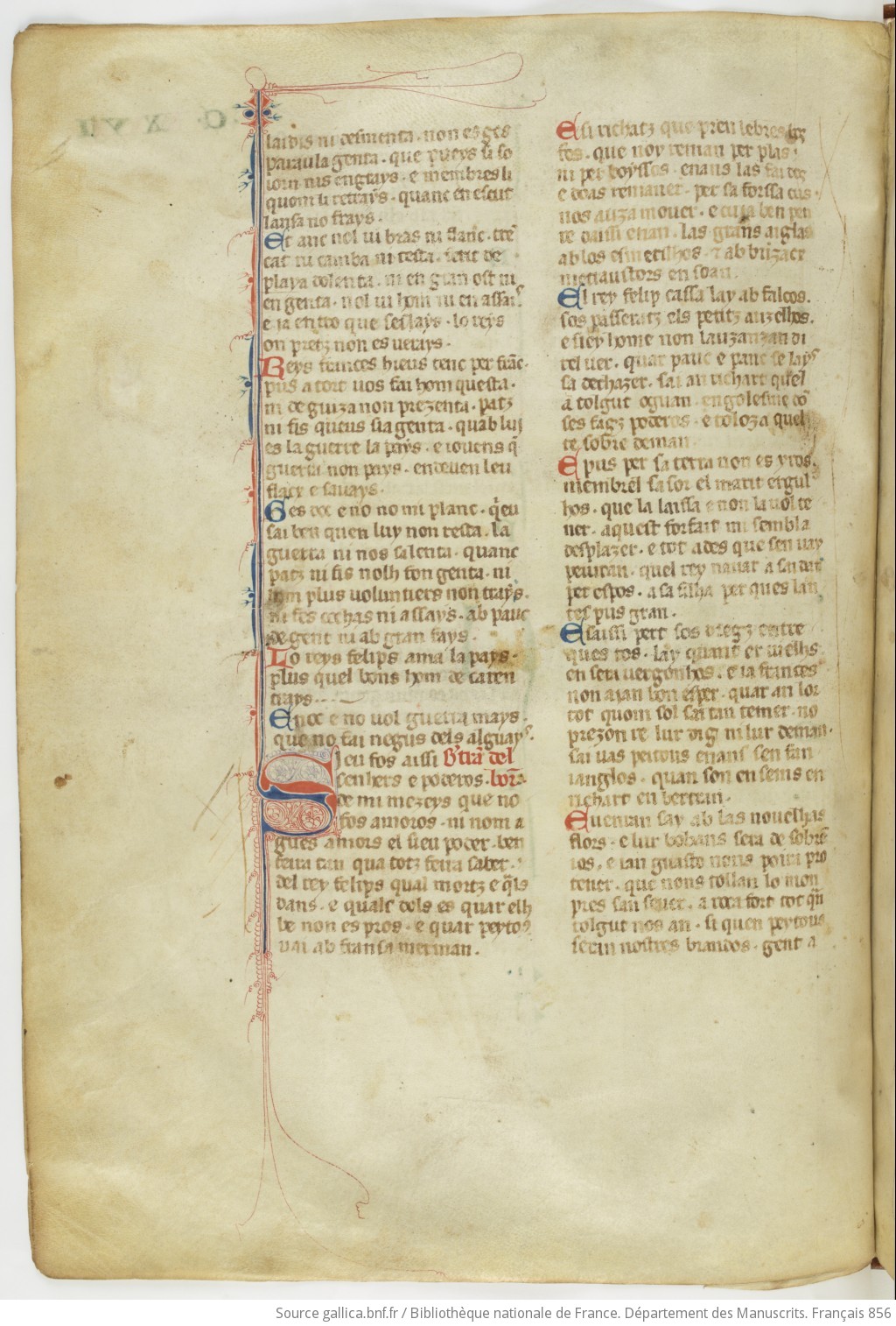 pesa. Et ac dich al rei felip com perdia d(en) ci(n)c ducaz los tres. ede giortz la renda el perchaz. Eco[...] caercins remania en guerra et en ba- ra[...] et la terra dangolerma. Ecom frances e[...]ergoignon auian cambiat honor p(er) cobe- [...]a. ecom lo reis felips auia anat plaideia(n) armatz sobre la riba del aiga. Ecom el non auia uolguda la patz cant fon desarmatz. E si tost com el fon armatz perdet per uiutat lardimen ela forza. Eque mal semblaua del cor enric loncle de raols del cambrais. Que desarmartz uolc q(ue) la patz si fezes de ra- ols son nebot ablos quatre fils nalbert. Ede pois que fon armatz no(n) uol patz ni co(n)cordi. Ecom totz reis era aunitz edesonratz pois co- mensaua adautrerei per terra qa qel reis li tolgues. Cant el fazia patz ni treua tro la demanda queil fazia agues co(n)qista ereco- brat so que fos dreitz erasos. Don li autre rei lo tenon desiritat. Eper far uergoingna alz ca(m)panes dels esterlins que foron semenat entre lor. Perso qeill uolgues son tornar a la guerra. Tuit li baron de peitieus ede lemo- zin enforon molt alegre. Que molt erent trist de la patz. p(er) so que meins neron onrat ecar tengut per amdos los reis <lo reis> richartz sica(r)- guet molt dorgoill da questa patz. Ecomen- set far tortz edesmesuras en la terras del rei de fransa. Que marcauon ab las terras den richart. El reis felips uenia areclam ad ai- cels que auian faita la patz entre lor dos. En richartz no uolia per lor tort ni dreg far. Don fon ordenatz per lor uns parlame(n)s on foron ensems en la marcha de torena ede beiriu. El reis felips si fetz mains reclams den richart. Don amdui uengron agrans paraulas et amalas. Si qen richart lo desme(n)- ti el clamet uil recrezen esis desfieron esis partiron mal. Ecant Bertrans de born auzi queil eront mal partit sifo molt alegres. Et aisso fon el temps al comensame(n)t destiu. Don Bertrans fetz aquest siruentes que uos aras auziretz. Al doutz termini blanc. Del pascor uez la estat. Et en aquel sirue(n)tes el pois fort lo rei felip. Quel degues comensar la gue(r)ra ab lo rei richart. afuoc et asanc. Edis quell reis felips uolia mais patz cuns morgues. En richart ab cui el sapellaua oc enon uolia mais guerra que negus dels algais. Queron qatre fraire gran raubaudor eraubaue(n) eme |